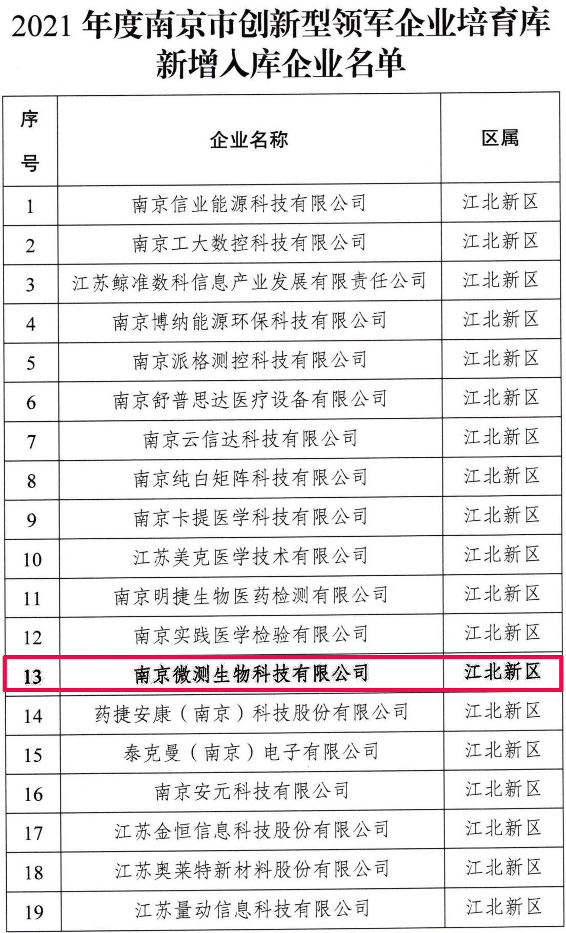 南京微測生物科技有限公司成功入選2021年度南京市創(chuàng)新型領(lǐng)軍企業(yè)培育庫入庫企業(yè)榜單。